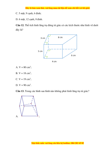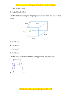 Câu 12. Thể tích hình lăng trụ đứng tứ giác có các kích thước như hình vẽ dưới đây là? A. V = 80 cm3; B. V = 18 cm3; C. V = 19 cm3; D. V = 90 cm3.