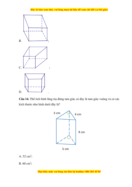 Câu 2. Số cạnh của hình lăng trụ đứng tam giác là? A. 9 cạnh; B. 8 cạnh; C. 5 cạnh; D. 6 cạnh.