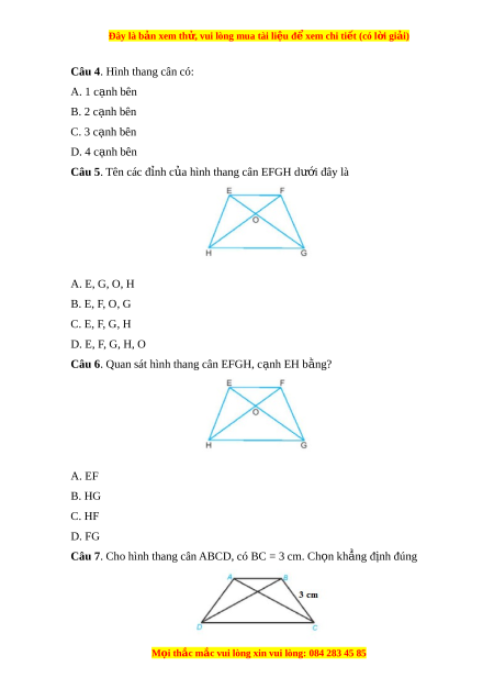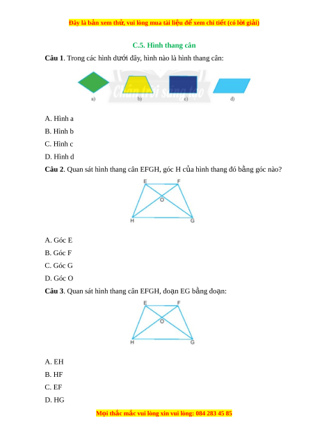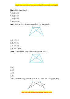Câu 3. Quan sát hình thang cân EFGH, đo n ạ EG b ng đo ằ n: ạ A. EH B. HF C. EF D. HG M i