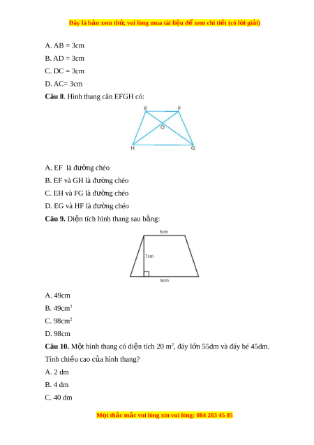 Câu 8. Hình thang cân EFGH có: A. EF là đư ng ờ chéo B. EF và GH là đư ng chéo ờ C. EH và FG là đư ng chéo ờ D. EG và HF là đư ng chéo ờ Câu 9. Di n t ệ ích hình thang sau b ng: ằ A. 49cm B. 49cm2 C. 98cm2 D. 98cm Câu 10. M t ộ hình thang có di n t ệ ích 20 m2, đáy l n 55dm ớ và đáy bé 45dm. Tính chi u cao ề c a hì ủ nh thang? A. 2 dm B. 4 dm C. 40 dm M i