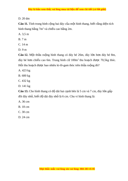 Câu 11. Tính trung bình c ng ộ hai đáy c a m ủ t ộ hình thang, bi t ế r ng di ằ n t ệ ích hình thang b ng 7m ằ 2 và chi u cao ề b ng 2m ằ . A. 3,5 m B. 7 m C. 14 m D. 9 m Câu 12. M t ộ th a ử ru ng
