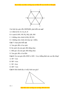 Câu 8. Cho tam giác đ u ề MNP có MN = 5cm, kh ng đ ẳ nh nào s ị au đây đúng? A. NP = 3cm B. MP = 4cm C. NP = 6cm D. MP = 5cm Câu 9. Hình dư i