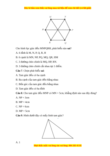ờ chéo chính là MQ, HP, RN. D. 3 đư ng chéo ờ chính c t ắ nhau t i ạ 1 đi m ể . Câu 7. Ch n phát ọ bi u ể sai: A. Tam giác đ u ề có ba c nh ạ B. Ba c nh ạ c a t ủ am giác đ u b ề ng ằ nhau C. Bốn góc c a t ủ am giác đ u b ề ng ằ nhau D. Tam giác đ u ề có ba đ nh ỉ