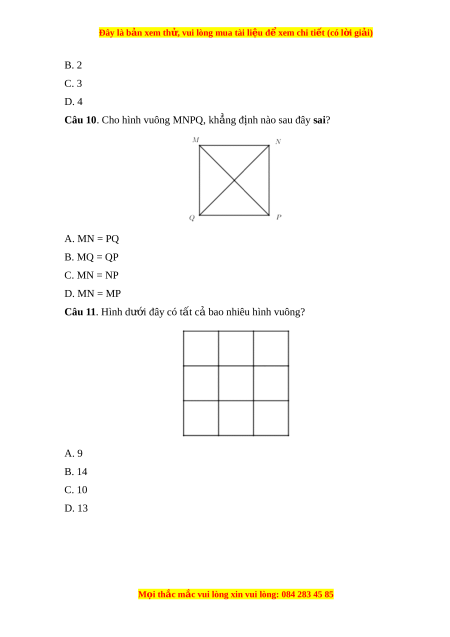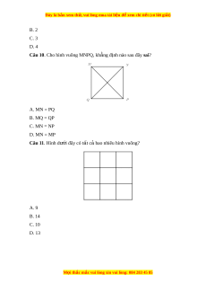 Câu 10. Cho hình vuông MNPQ, kh ng đ ẳ nh nào s ị au đây sai? A. MN = PQ B. MQ = QP C. MN = NP D. MN = MP Câu 11. Hình dư i ớ đây có tất c bao nhi ả êu hình vuông? A. 9 B. 14 C. 10 D. 13 M i