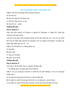 Bài 18: Hydrogen halide và hydrohalic acid Câu 1. Liên k t ế trong h p ợ ch t ấ hydrogen halide là A. liên k t ế ion. B. liên k t ế c ng hóa t ộ r không c ị c. ự C. liên k t ế c ng ộ hóa tr có c ị c. ự D. liên k t ế cho – nh n. ậ Hư ng d ớ ẫn gi i ả Đáp án đúng là: C H p ợ ch t ấ g m