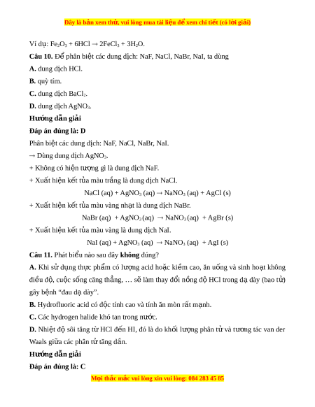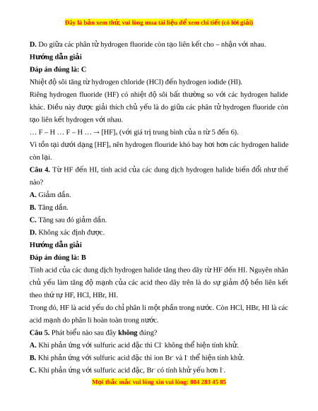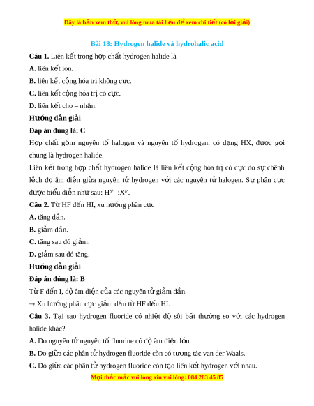 Đây là bản xem th , vu ử i lòng mua tài li u ệ đ xe ể m chi ti t (c ế ó l i ờ gi i ả ) D. Do gi a ữ các phân t hydr ử ogen fluoride còn t o ạ liên k t ế cho – nh n ậ v i ớ nhau. Hư ng d ớ ẫn gi i ả Đáp án đúng là: C Nhiệt đ s ộ ôi tăng t hyd ừ rogen chloride (HCl) đ n hydr ế ogen iodide (HI).