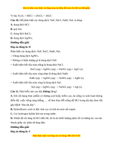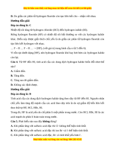 ạ [HF]n nên hydrogen flouride khó bay h i ơ h n ơ các hydrogen halide còn l i ạ . Câu 4. Từ HF đ n ế HI, tính acid c a ủ các dung d ch ị hydrogen halide bi n ế đ i ổ như thế nào? A. Gi m ả d n. ầ B. Tăng dần. C. Tăng sau đó gi m ả d n. ầ D. Không xác đ nh đ ị ược. Hư ng d ớ ẫn gi i ả Đáp án đúng là: B Tính acid c a ủ các dung d ch ị