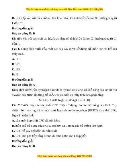 ấ oxi hóa khác nhau thì tính kh ử c a ủ ion X- thư ng ờ tăng t ừ Cl- đ n I ế -. Câu 6. Dung d ch ị nư c ớ c a ủ ch t ấ nào sau đây đư c ợ sử d ng ụ để kh c ắ các chi ti t ế lên th y t ủ inh? A. HF. B. HCl. C. HBr. D. HI. Hư ng d ớ ẫn gi i ả Đáp án đúng là: A Dung d ch ị nư c ớ c a