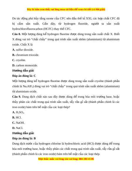 Câu 8. M t l ng đáng k hydrogen fluorine đ c dùng trong s n xu t ch t X. Bi tộ ượ ể ượ ả ấ ấ ế