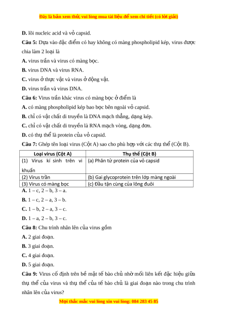 A. có mang phospholipid kep bao b c ọ bên ngoai v caps ỏ id. B. chi có v t ậ chất di truy n l ê a DNA m ch ạ th ng, d ă ng ạ kep. C. chi có v t ậ chất di truy n l ê a RNA m ch ạ vong, d ng đ ạ n. ơ D. có th t ụ h l ê a protein c a ủ v caps ỏ id. Câu 7: Ghep tên lo i ạ virus (C t ộ A) sao cho phù h p ợ v i ớ cac th t ụ h ( ê C t ộ B). Loại virus (Cột A) Thụ thể (Cột B) (1) Virus kí sinh trên vi