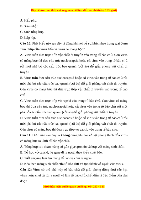 ư khac nhau trong giai đo n ạ xâm nh p c ậ a ủ virus tr n va vi ầ rus có mang b c? ọ A. Virus tr n ầ đ a ư tr c ư ti p ế v t ậ ch t ấ di truy n ê vao trong t ế bao ch . ủ Con virus có mang b c ọ thì đ a ư c u ấ truc nucleocapsid ho c ă c ả virus vao trong t ế bao chủ rôi m i ớ pha bỏ cac c u ấ truc bao quanh (c i ở ao) đê gi i ả phóng v t ậ ch t ấ di truy n. ê B. Virus tr n ầ đ a ư c u ấ truc nucleocapsid ho c ă c ả virus vao trong t ế bao ch ủ r i ô m i ớ pha bỏ cac c u ấ truc bao quanh (c i ở ao) đê gi i ả phóng v t ậ ch t ấ di truy n. ê Con virus có mang b c ọ thì đ a ư tr c ư ti p ế v t ậ ch t ấ di truy n ê vao trong tế bao ch . ủ C. Virus tr n ầ đ a ư tr c ư ti p ế v ỏ capsid vao trong t ế bao ch . ủ Con virus có mang b c ọ thì đ a ư c u ấ truc nucleocapsid ho c ă c ả virus vao trong t ế bao ch ủ r i ô m i ớ pha b cac ỏ cấu truc bao quanh (c i ở ao) đ gi ê i ả phóng v t ậ ch t ấ di truy n. ê D. Virus tr n ầ đ a ư c u ấ truc nucleocapsid ho c ă c vi ả rus vao trong t bao ế ch ủ r i ô m i ớ pha bỏ cac c u ấ truc bao quanh (c i ở ao) đê gi i ả phóng v t ậ ch t ấ di truy n. ê Con virus có mang b c ọ thì đ a t ư r c t ư i p v ế caps ỏ id vao trong t bao ch ế . ủ Câu 11: Đi u