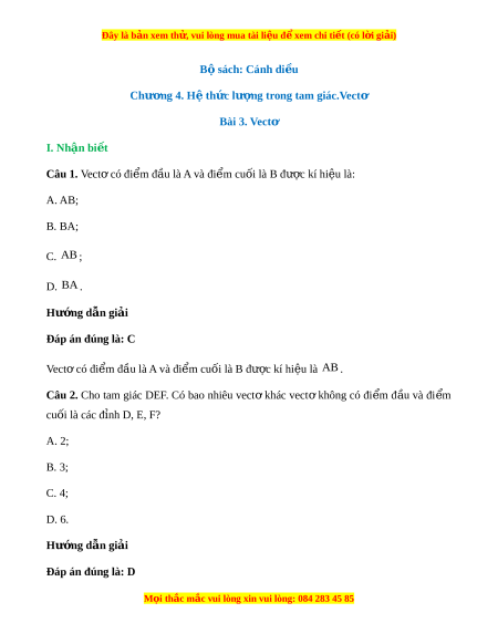 Đây là bản xem th , vu ử i lòng mua tài li u ệ đ xe ể m chi ti t (c ế ó l i ờ gi i ả ) Bộ sách: Cánh di u ề Chư ng 4. H ơ t ệ h c ứ lư ng t ợ rong tam giác.Vectơ Bài 3. Vectơ I. Nhận bi t ế Câu 1. Vect có đi ơ m ể đầu là A và đi m ể cu i ố là B đư c ợ kí hi u l ệ à: A. AB; B. BA;