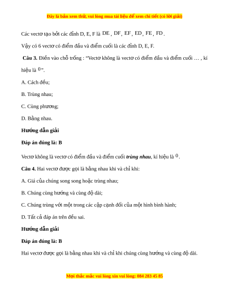 , E, F là DE , DF, EF , ED , FE , FD . V y ậ có 6 vectơ có đi m ể đầu và đi m ể cuối là các đ nh D ỉ , E, F. Câu 3. Đi n ề vào chỗ tr ng ố : “Vect ơ không là vect ơ có đi m ể đ u ầ và đi m ể cu i ố … , kí hiệu là 0 ”. A. Cách đ u ề ; B. Trùng nhau; C. Cùng phư ng ơ ; D. B ng nhau ằ . Hư ng d ớ ẫn gi i ả Đáp án đúng là: B Vect không l ơ à vectơ có đi m ể đầu và đi m