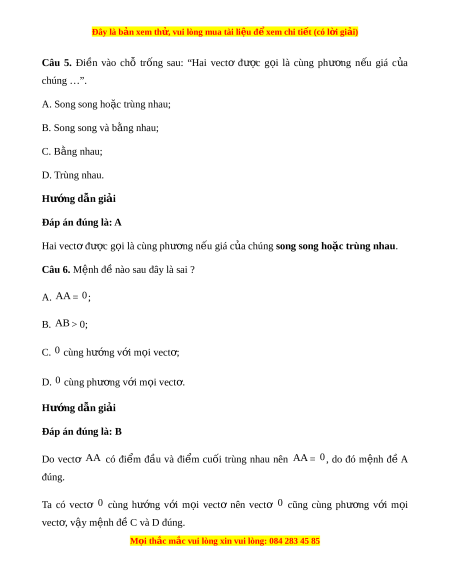 Đây là bản xem th , vu ử i lòng mua tài li u ệ đ xe ể m chi ti t (c ế ó l i ờ gi i ả ) Câu 5. Đi n ề vào chỗ tr ng ố sau: “Hai vectơ đư c ợ g i ọ là cùng phư ng ơ n u ế giá c a ủ chúng …”. A. Song song ho c t ặ rùng nhau; B. Song song và b ng ằ nhau; C. B ng ằ nhau; D. Trùng nhau. Hư ng d ớ ẫn gi i ả Đáp án đúng là: A Hai vectơ đư c ợ g i ọ là cùng phư ng n ơ u ế giá c a chúng ủ song song ho c t ặ rùng nhau.