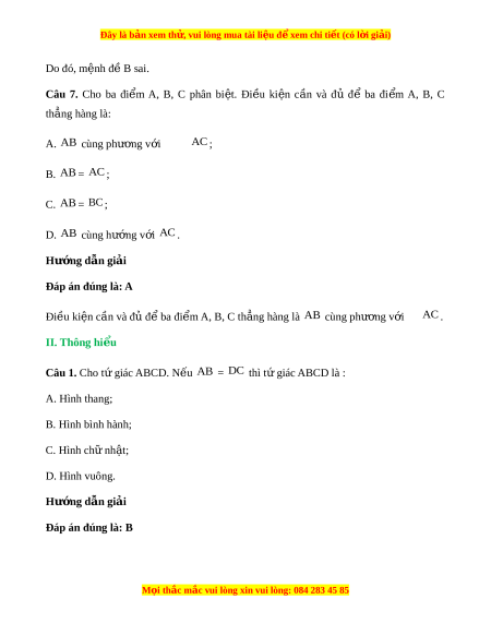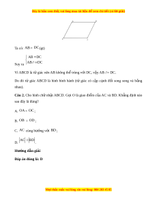 C. AB = BC ; D. AB cùng hư ng ớ v i ớ AC . Hư ng d ớ ẫn gi i ả Đáp án đúng là: A Đi u ki ề ện cần và đ đ ủ ể ba đi m ể A, B, C th ng hàng ẳ là AB cùng phư ng v ơ i ớ AC . II. Thông hi u ể Câu 1. Cho t gi ứ ác ABCD. N u ế AB = DC thì t gi ứ ác ABCD là : A. Hình thang; B. Hình bình hành; C. Hình ch nh ữ t ậ ; D. Hình vuông. Hư ng d ớ ẫn gi i ả Đáp án đúng là: B M i ọ thắc m c