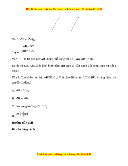 Câu 2. Cho hình ch nh t ABCD. G i O là giao đi m c a AC và BD. Kh ng đ nh nàoữ ậ ọ ể ủ ẳ ị