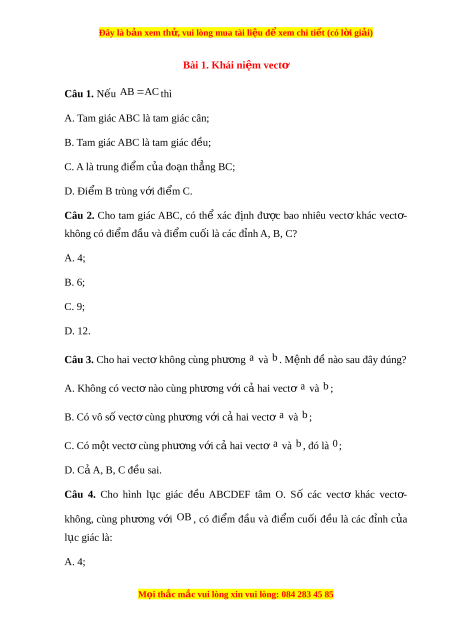 Đây là bản xem th , vu ử i lòng mua tài li u ệ đ xe ể m chi ti t ế (có l i ờ gi i ả ) Bài 1. Khái ni m ệ vectơ Câu 1. N u ế AB A C thì