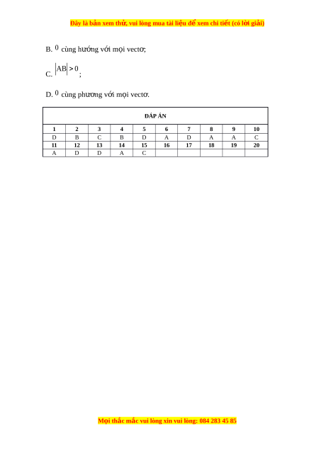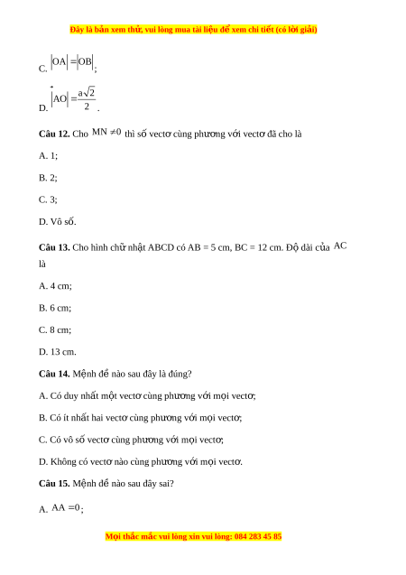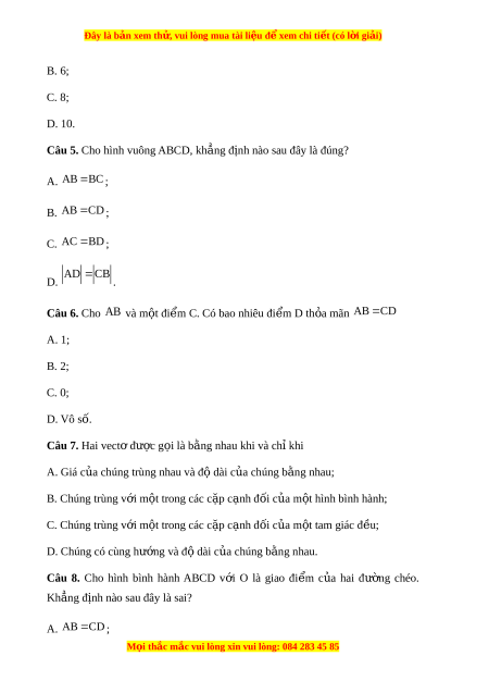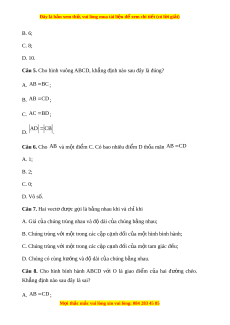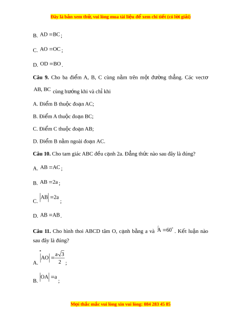 Đây là bản xem th , vu ử i lòng mua tài li u ệ đ xe ể m chi ti t ế (có l i ờ gi i ả ) B. AD B C ; C. AO O C ; D. OD B O . Câu 9. Cho ba đi m ể A, B, C cùng n m ằ trên m t ộ đư ng ờ th ng. ẳ Các vectơ AB, BC cùng hư ng khi ớ và chỉ khi A. Đi m ể B thu c ộ đo n ạ AC; B. Đi m ể A thu c đo ộ n ạ BC; C. Đi m ể C thu c đo ộ n ạ AB; D. Đi m ể B n m ằ ngoài đo n ạ AC.
