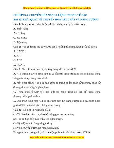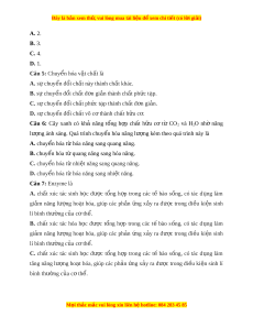 Câu 1: Trong t bao, năng l ê ư ng ơ đư c t ơ ich luy ch y u u d ê ư i ơ d ng a A. nhiêt năng. B. c năng. ơ C. hóa năng. D. điên năng. Câu 2: H p ch ơ ât nao sau đây đư c ơ coi la “đồng ti n ề năng lư ng c ơ a u t bao”? ê A. NADPH. B. ATP. C. ADP. D. FADH2. Câu 3: Phat bi u nao s ê
