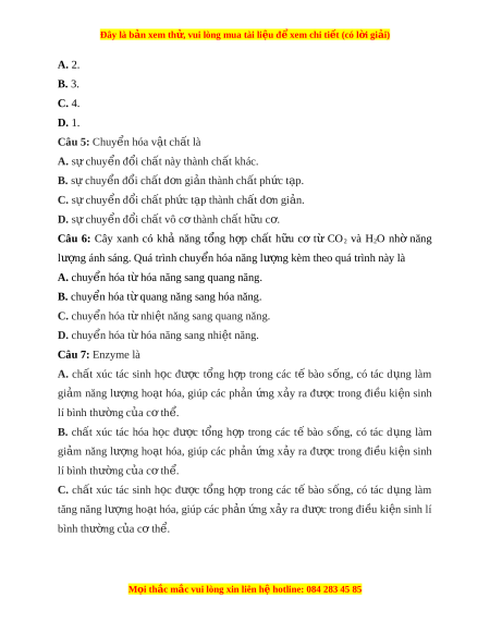 Đây là bản xem th , vu ử i lòng mua tài li u ệ đ xe ể m chi ti t (c ế ó l i ờ gi i ả ) A. 2. B. 3. C. 4. D. 1. Câu 5: Chuy n hóa ê v t â ch t â la A. s chuy ư n đ ê ôi chât nay thanh ch t â khac. B. s chuy ư n ê đôi ch t â đ n gi ơ n a thanh ch t â ph c t ư p. a C. s chuy ư n đ ê ôi chât ph c t ư p t a hanh ch t â đ n ơ gi n. a D. s chuy ư n đ ê ôi chât vô c t ơ hanh ch t â h u c ư . ơ