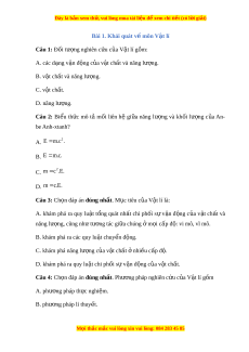 Câu 1: Đối tư ng nghi ợ ên c u ứ c a ủ V t ậ lí g m ồ : A. các d ng ạ v n đ ậ ng ộ c a v ủ t ậ ch t ấ và năng lư ng. ợ B. v t ậ ch t ấ và năng lư ng. ợ C. v t ậ ch t ấ . D. năng lư ng. ợ Câu 2: Bi u ể th c ứ mô tả m i ố liên hệ gi a ữ năng lư ng ợ và kh i ố lư ng ợ c a ủ An- be Anh-xtanh? A. 2 E m .c . B. E m .c. C. 2 m c .E. D. m c .E. Câu 3: Ch n
