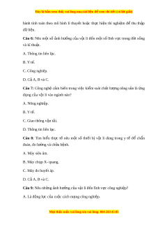 ậ lí dùng trong y tế để ch n ẩ đoán, đo lư ng và ch ờ a ữ b nh. ệ A. Máy siêu âm. B. Máy ch p X ụ - quang. C. Máy đo huy t ế áp. D. Cả A, B và C. Câu 9: Nêu nh ng ữ nh h ả ư ng ở c a v ủ t ậ lí đ n ế lĩnh v c ự công nghi p? ệ A. Là đ ng l ộ c c ự a ủ cu c cách ộ m ng công nghi ạ p. ệ M i