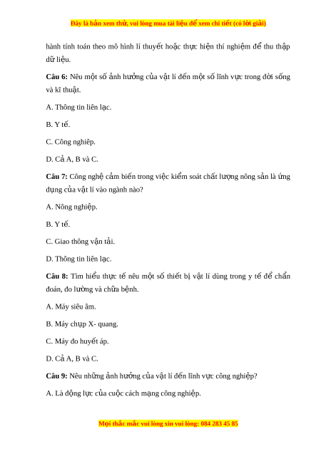 hành tính toán theo mô hình lí thuy t ế ho c ặ th c ự hi n ệ thí nghi m ệ để thu th p ậ d l ữ i u. ệ Câu 6: Nêu m t ộ số nh ả hư ng ở c a ủ v t ậ lí đ n ế m t ộ s ố lĩnh v c ự trong đ i ờ s ng ố và kĩ thu t ậ . A. Thông tin liên l c. ạ B. Y t . ế C. Công nghiêp. D. Cả A, B và C.