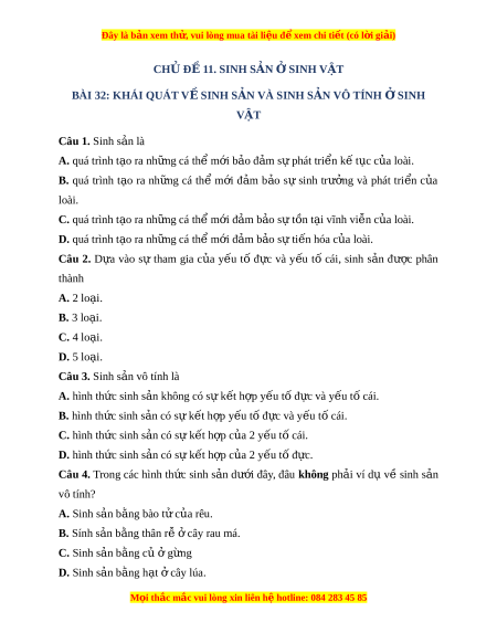 BÀI 32: KHÁI QUÁT V SI Ề NH S N Ả VÀ SINH S N Ả VÔ TÍNH SI Ở NH VẬT Câu 1. Sinh s n l ả à A. quá trình t o r ạ a nh ng cá ữ thể m i ớ b o đ ả m ả s phát ự tri n k ể t ế c c ụ a ủ loài. B. quá trình t o ạ ra nh ng ữ cá thể m i ớ đ m ả b o ả sự sinh trư ng ở và phát tri n ể c a ủ loài. C. quá trình t o r ạ a nh ng cá ữ thể m i ớ đ m ả b o ả s t ự n t ồ i ạ vĩnh vi n c ễ a ủ loài. D. quá trình t o r ạ a nh ng cá ữ thể m i ớ đ m ả b o ả s t ự i n hóa c ế a ủ loài. Câu 2. D a ự vào sự tham gia c a ủ y u ế tố đ c ự và y u ế tố cái, sinh s n ả đư c ợ phân thành A. 2 lo i ạ . B. 3 lo i ạ . C. 4 lo i ạ . D. 5 lo i ạ . Câu 3. Sinh s n vô t ả ính là A. hình th c s ứ inh s n ả không có sự k t ế h p y ợ u t ế đ ố c và y ự u t ế cái ố . B. hình th c s ứ inh s n có ả s k ự t ế h p ợ y u t ế đ ố c ự và y u t ế cái ố . C. hình th c s ứ inh s n ả có sự k t ế h p ợ c a ủ 2 y u t ế ố cái. D. hình th c s ứ inh s n ả có sự k t ế h p ợ c a ủ 2 y u t ế ố đ c ự .