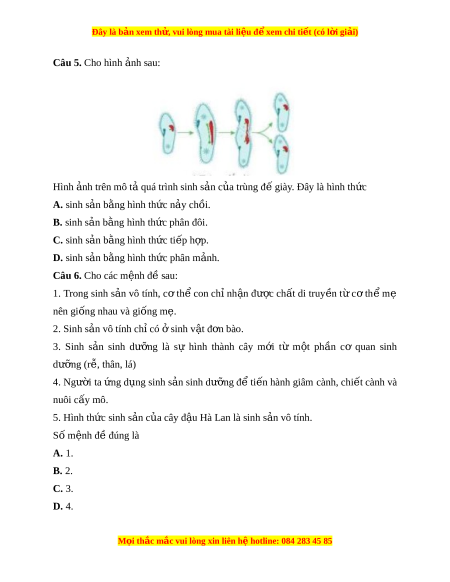 Đây là bản xem th , vu ử i lòng mua tài li u ệ đ xe ể m chi ti t (c ế ó l i ờ gi i ả ) Câu 5. Cho hình nh s ả au: Hình nh ả trên mô t quá t ả rình sinh s n ả c a t ủ rùng đ gi ế ày. Đây là hình th c ứ A. sinh s n ả b ng hì ằ nh th c n ứ y ả ch i ồ . B. sinh s n b ả ng ằ hình th c phân đôi ứ . C. sinh s n ả b ng hì ằ nh th c t ứ i p h ế p. ợ D. sinh s n ả b ng hì ằ nh th c phân ứ m nh. ả