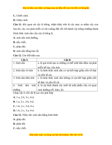 ấ rồi trở thành cây b ng ỏ trư ng ở thành. Hình th c ứ sinh s n ả c a cây ủ lá b ng l ỏ à A. sinh s n ả sinh dư ng ỡ . B. n y ch ả ồi. C. phân đôi. D. sinh s n ả b ng bào t ằ . ử Câu 12. Cho d ki ữ n s ệ au: C t ộ A C t ộ B 1. Sinh s n ả a. là quá trình t o ạ ra nh ng cá ữ th ể m i ớ b o ả đ m ả s ự phát tri n k ể ế t c c ụ a l ủ oài. 2. Sinh s n ả vô tính b. là hình th c ứ sinh s n ả có sự k t ế h p ợ gi a ữ y u ế t ố đ c ự và y u t ế ố cái. 3. Sinh s n ả h u t ữ ính c. là hình th c ứ sinh s n ả không có sự k t ế h p ợ gi a ữ y u ế tố đ c ự và y u t ế ố cái. 4. Sinh s n