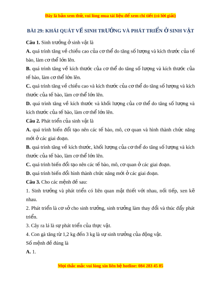 BÀI 29: KHÁI QUÁT V SI Ề NH TRƯ N Ở G VÀ PHÁT TRI N Ể SI Ở NH V T Ậ Câu 1. Sinh trư ng ở s ở inh v t ậ là A. quá trình tăng v ề chi u ề cao c a ủ c ơ th ể do tăng s ố lư ng ợ và kích thư c ớ c a ủ tế bào, làm cơ th l ể n l ớ ên.