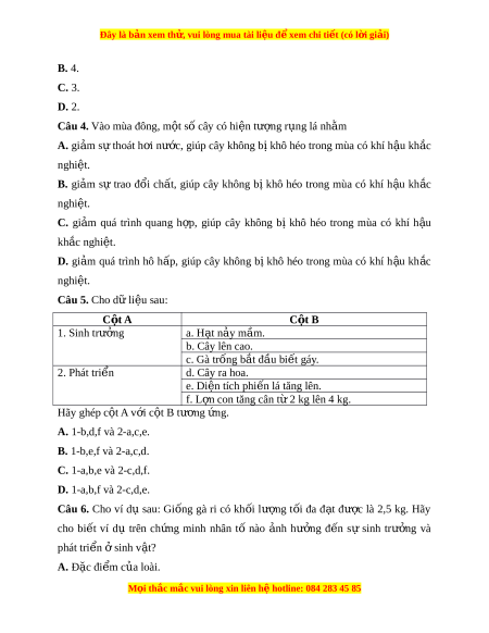 ấ giúp cây không b ịkhô héo trong mùa có khí h u ậ kh c ắ nghiệt. Câu 5. Cho d l ữ i u s ệ au: C t ộ A C t ộ B 1. Sinh trư ng ở a. H t ạ n y ả m m ầ . b. Cây lên cao. c. Gà trống b t ắ đ u b ầ i t ế gáy. 2. Phát tri n ể d. Cây ra hoa. e. Diện tích phi n l ế á tăng lên. f. L n con t ợ ăng cân t 2 kg l ừ ên 4 kg. Hãy ghép c t ộ A v i ớ c t ộ B tư ng ơ ng. ứ A. 1-b,d,f và 2-a,c,e. B. 1-b,e,f và 2-a,c,d. C. 1-a,b,e và 2-c,d,f. D. 1-a,b,f và 2-c,d,e.