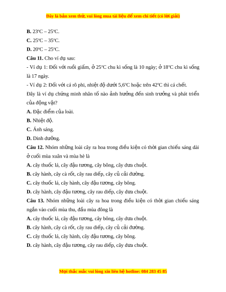 Đây là bản xem th , vu ử i lòng mua tài li u ệ đ xe ể m chi ti t (c ế ó l i ờ gi i ả ) B. 23oC – 25oC. C. 25oC – 35oC. D. 20oC – 25oC. Câu 11. Cho ví d s ụ au: - Ví dụ 1: Đ i ố v i ớ ru i ồ gi m ấ , ở 25oC chu kì s ng ố là 10 ngày; ở 18oC chu kì s ng ố là 17 ngày. - Ví dụ 2: Đối v i ớ cá rô phi, nhi t ệ đ d ộ ư i ớ 5,6oC ho c ặ trên 42oC thì cá ch t ế . Đây là ví dụ ch ng ứ minh nhân tố nào nh ả hư ng ở đ n ế sinh trư ng ở và phát tri n ể c a ủ đ ng v ộ t ậ ? A. Đặc đi m ể c a ủ loài. B. Nhi t ệ đ . ộ C. Ánh sáng. D. Dinh dư ng. ỡ Câu 12. Nhóm nh ng