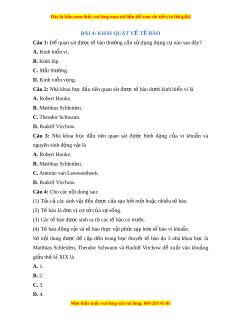 Câu 2: Nhà khoa h c đ o âu tiên quan sát đư c t ợ bào d ế ư i ơ kính hi n vi ê là A. Robert Hooke. B. Matthias Schleiden. C. Theodor Schwann. D. Rudolf Virchow. Câu 3: Nhà khoa h c o đ u â tiên quan sát đư c ợ hinh d ng a c a u vi khu n â và nguyên sinh đ ng ô v t â là A. Robert Hooke. B. Matthias Schleiden.
