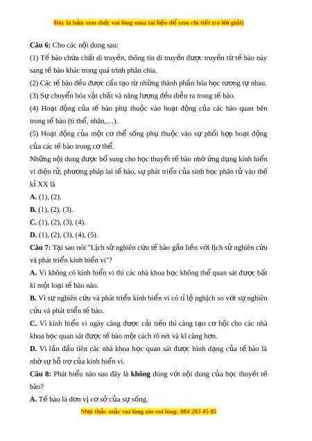 Đây là bản xem th , vu ử i lòng mua tài li u ệ đ xe ể m chi ti t (c ế ó l i ờ gi i ả ) Câu 6: Cho các n i ô dung sau: (1) Tế bào ch a ứ ch t ấ di truy n, ề thông tin di truy n ề đư c ợ truy n ề t ừ t ế bào này sang t bào khác ế trong quá trinh phân chia. (2) Các t bào đ ế u đ ề ược cấu t o t a nh ừ ng ữ thành ph n hóa â h c t o ư ng t ơ nhau. ư (3) S chuy ư n ê hóa v t â ch t ấ và năng lư ng ợ đ u di ề n r ê a trong t bào. ế (4) Ho t a đ ng ô c a u tế bào phụ thu c ô vào ho t a đ ng ô c a u các bào quan bên trong t bào ( ế ti th , ê nhân,…). (5) Ho t a đ ng ô c a u m t ô cơ thê s ng ô phụ thu c ô vào sư ph i ô h p ợ ho t a đ ng ô c a u các t bào ế trong c t ơ h . ê Nh ng ữ n i ô dung đư c ợ b ô sung cho h c o thuy t ế t bào ế nhờ ng ứ d ng ụ kính hi n ê vi đi n ệ t , ử phư ng ơ pháp lai t ế bào, s ư phát tri n ê c a u sinh h c o phân tử vào thế kỉ XX là A. (1), (2). B. (1), (2), (3). C. (1), (2), (3), (4).