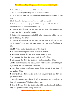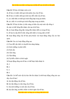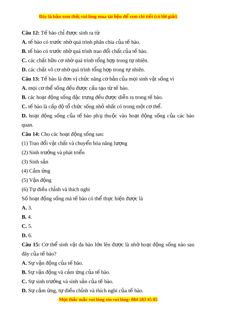 Đây là bản xem th , vu ử i lòng mua tài li u ệ đ xe ể m chi ti t (c ế ó l i ờ gi i ả ) Câu 12: T bào ch ế ỉ đư c ợ sinh ra từ A. t bào ế có trư c ơ nh quá t ờ rinh phân chia c a u t bào. ế B. t bào có t ế rư c nh ơ quá t ờ rinh trao đ i ô ch t ấ c a u t bào. ế C. các chất h u c ữ nh ơ quá t ờ rinh t ng h ô p t ợ rong t nhi ư ên. D. các chất vô c nh ơ quá t ờ rinh t ng h ô p ợ trong t nhi ư ên. Câu 13: T bào l ế à đ n v ơ ị ch c ứ năng c b ơ n ả c a m u i o sinh v t â s ng vi ô A. m i o cơ th s ê ông đ u đ ề ư c ợ c u t ấ o t a t ừ bào. ế B. các ho t a đ ng s ô ông đ c ặ tr ng đ ư u ề đư c di ợ n r ê a trong t bào. ế C. t bào ế là c p đ ấ t ô ô ch c ứ sông nh nh o t ấ có trong m t ô c t ơ h . ê D. ho t a đ ng ô s ng ô c a u t ế bào ph ụ thu c ô vào ho t a đ ng ô s ng ô c a u các bào quan. Câu 14: Cho các ho t a đ ng s ô ông sau: (1) Trao đôi v t â ch t ấ và chuy n ê hóa năng lư ng ợ (2) Sinh trư ng và phát ở tri n ê (3) Sinh s n ả (4) C m ả ng ứ (5) V n â đ ng ô (6) T đi ư u ch ề ỉnh và thích nghi Sô ho t a đ ng s ô ông mà t bào có t ế h t ê h c hi ư n đ ệ ư c ợ là A. 3. B. 4. C. 5. D. 6.
