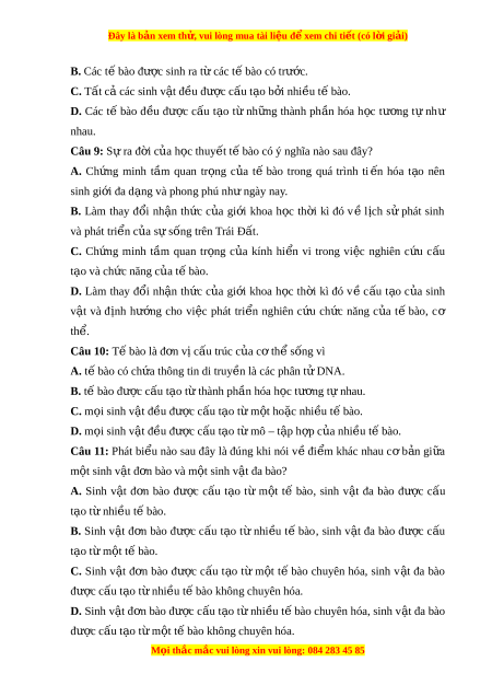 Đây là bản xem th , vu ử i lòng mua tài li u ệ đ xe ể m chi ti t ế (có l i ờ gi i ả ) B. Các t bào đ ế ư c ợ sinh ra t các ừ t bào có t ế rư c. ơ C. Tất c các ả sinh v t â đ u ề đư c c ợ u t ấ o a b i ở nhi u t ề bào. ế D. Các t ế bào đ u ề đư c ợ c u ấ t o a t ừ nh ng ữ thành ph n â hóa h c o tư ng ơ t ư như nhau. Câu 9: S r ư a đ i ờ c a u h c t o huy t ế t bào có y ngh ế ia nào sau đây? A. Ch ng ứ minh t m â quan tr ng o c a u t ế bào trong quá trinh ti n ế hóa t o a nên sinh gi i ơ đa d ng a và phong phú nh ngày nay ư . B. Làm thay đ i ô nh n â th c ứ c a u gi i ơ khoa h c o th i ờ ki đó v ề l ch ị s ử phát sinh và phát tri n ê c a s u s ư ông trên Trái Đ t ấ . C. Ch ng ứ minh t m â quan tr ng o c a u kính hi n ê vi trong vi c ệ nghiên c u ứ c u ấ t o và ch a c ứ năng c a u t bào. ế D. Làm thay đ i ô nh n â th c ứ c a u gi i ơ khoa h c o th i ờ ki đó v ề c u ấ t o a c a u sinh v t â và đ nh ị hư ng ơ cho vi c ệ phát tri n ê nghiên c u ứ ch c ứ năng c a u t ế bào, cơ th . ê Câu 10: T bào ế là đ n v ơ c ị u t ấ rúc c a u c t ơ h s ê ng vi ô A. t bào có ch ế a ứ thông tin di truy n l ề à các phân t D ử NA. B. t bào ế đư c c ợ ấu t o t a t ừ hành ph n hóa â h c t o ư ng t ơ nhau. ư C. m i o sinh v t â đ u đ ề ư c c ợ u t ấ o a t m ừ t ô ho c ặ nhi u t ề bào. ế D. m i o sinh v t â đ u đ ề ư c c ợ u t ấ o a t m ừ ô – t p h â p c ợ a u nhi u t ề bào. ế Câu 11: Phát bi u