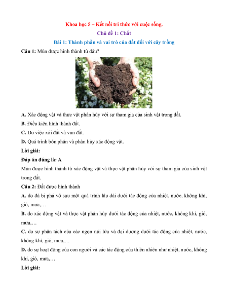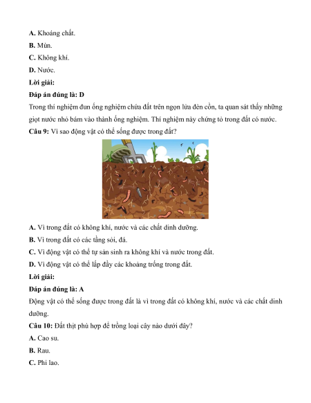 nổi lên. Thí nghiệm này chứng tỏ trong đất có thành phần nào? A. Không khí. B. Nước. C. Mùn. D. Khoáng chất. Lời giải: