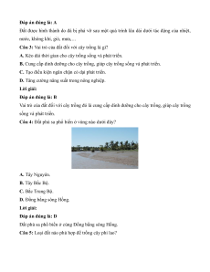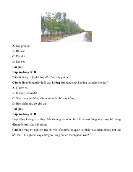 Câu 5: Loại đất nào phù hợp để trồng cây phi lao? A. Đất phù sa. B. Đất cát. C. Đất thịt. D. Đất sét. Lời giải: