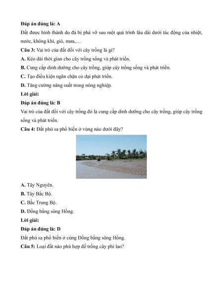 Câu 4: Đất phù sa phổ biến ở vùng nào dưới đây? A. Tây Nguyên. B. Tây Bắc Bộ. C. Bắc Trung Bộ.