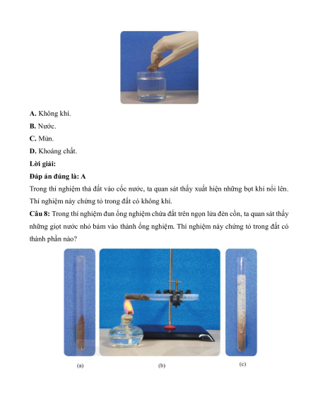 Câu 8: Trong thí nghiệm đun ống nghiệm chứa đất trên ngọn lửa đèn cồn, ta quan sát thấy