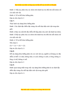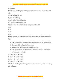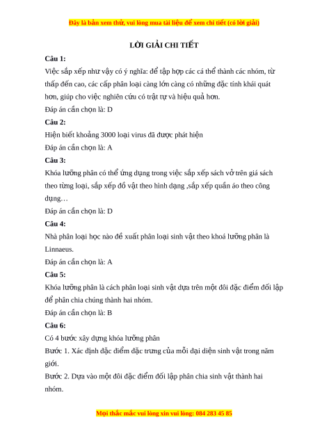 Đây là bản xem th , vu ử i lòng mua tài li u ệ đ xe ể m chi ti t ế (có l i ờ gi i ả ) L I Ờ GIẢI CHI TI T Ế Câu 1: Việc s p x ắ p ế nh v ư y có ý nghĩ ậ a: để t p h ậ p các ợ cá th t ể hành các nhóm, t ừ thấp đ n ế cao, các c p phân ấ lo i ạ càng l n càng ớ có nh ng đ ữ c ặ tính khái quát h n, gi ơ úp cho vi c nghi ệ ên c u có ứ tr t ậ t và hi ự u qu ệ h ả n. ơ Đáp án cần ch n ọ là: D Câu 2: Hi n bi ệ t ế kho ng 3000 l ả o i ạ virus đã đư c phát ợ hi n ệ Đáp án cần ch n ọ là: A Câu 3: Khóa lư ng phân ỡ có th ể ng d ứ ng t ụ rong vi c ệ s p ắ x p s ế ách v t ở rên giá sách theo t ng l ừ o i ạ , s p x ắ p đ ế ồ v t ậ theo hình d ng ,s ạ p x ắ p qu ế n áo t ầ heo công d ng… ụ Đáp án cần ch n ọ là: D Câu 4: Nhà phân lo i ạ h c nào đ ọ xu ề t ấ phân lo i ạ sinh v t ậ theo khoá lư ng phân l ỡ à Linnaeus. Đáp án cần ch n ọ là: A Câu 5: Khóa lư ng phân ỡ là cách phân lo i ạ sinh v t ậ d a ự trên m t ộ đôi đ c đi ặ m ể đ i ố l p ậ đ phân chi ể a chúng thành hai nhóm. Đáp án cần ch n ọ là: B Câu 6: Có 4 bư c ớ xây d ng khóa l ự ư ng ỡ phân Bư c ớ 1. Xác đ nh đ ị c ặ đi m ể đ c t ặ r ng c ư a m ủ ỗi đ i ạ di n s ệ inh v t ậ trong năm gi i ớ . Bư c ớ 2. D a vào m ự t ộ đôi đặc đi m ể đối l p phân chi ậ a sinh v t ậ thành hai nhóm. M i