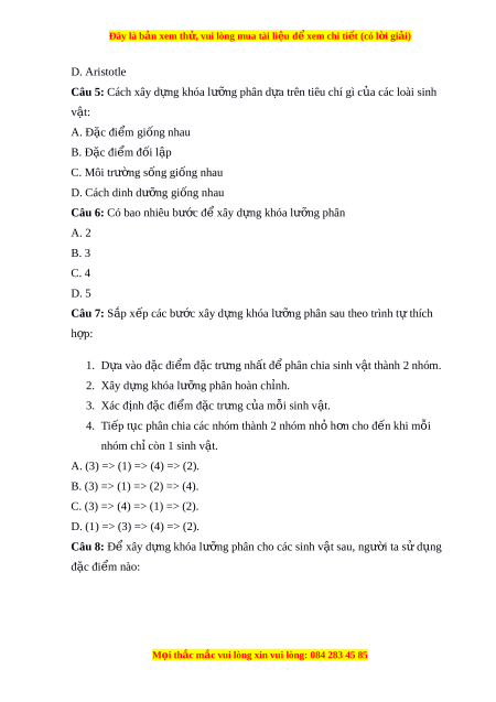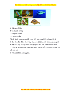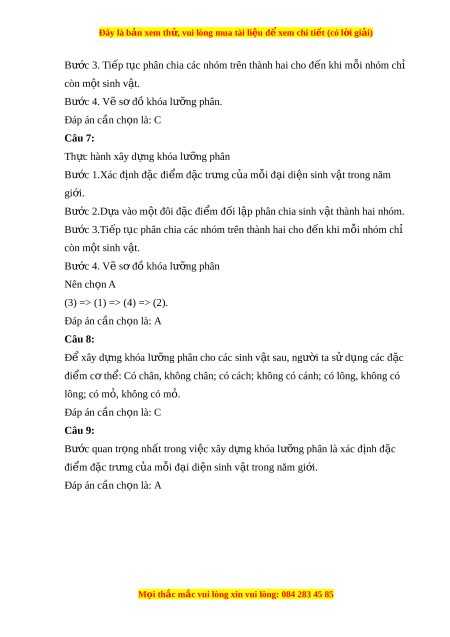 Đây là bản xem th , vu ử i lòng mua tài li u ệ đ xe ể m chi ti t ế (có l i ờ gi i ả ) A. Cấu t o t ạ bào ế B. Cách dinh dư ng ỡ C. Bộ ph n c ậ ơ thể D. Cách sinh s n ả Câu 9: Bư c quan t ớ r ng nh ọ ất trong vi c xây d ệ ng ự khóa lư ng phân l ỡ à A. Xác định đ c ặ đi m ể đ c t ặ r ng c ư a m ủ ỗi đ i ạ di n s ệ inh v t ậ trong năm gi i ớ . B. D a ự vào m t ộ đôi đ c ặ đi m ể đ i ố l p ậ phân chia sinh v t ậ thành hai nhóm. C. Ti p t ế c phân chi ụ