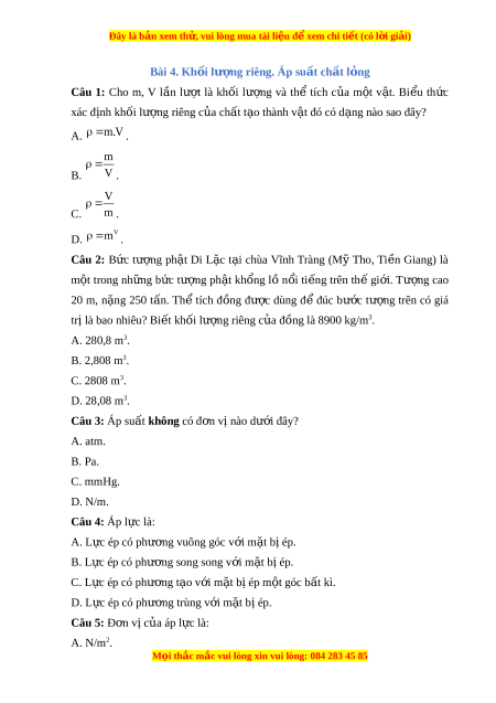 Đây là bản xem th , vu ử i lòng mua tài li u ệ đ xe ể m chi ti t ế (có l i ờ gi i ả ) Bài 4. Kh i ố lư ng ợ riêng. Áp su t ấ ch t ấ l ng ỏ Câu 1: Cho m, V l n ầ lư t ợ là kh i ố lư ng ợ và thể tích c a ủ m t ộ v t ậ . Bi u ể th c ứ xác định kh i ố lư ng ợ riêng c a ủ ch t ấ t o t ạ hành v t ậ đó có d ng nào ạ sao đây? A. m .V . m B. V . V C. m . V D. m . Câu 2: B c ứ tư ng ợ ph t ậ Di L c ặ t i
