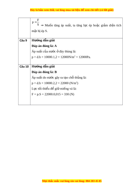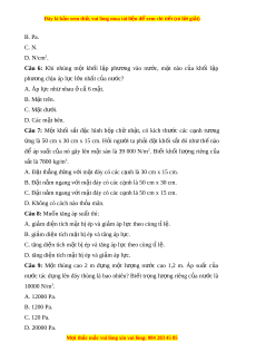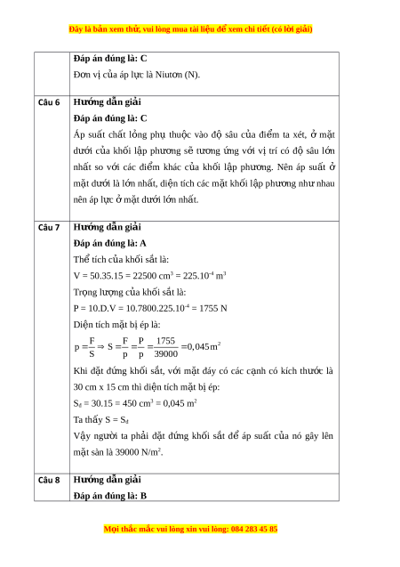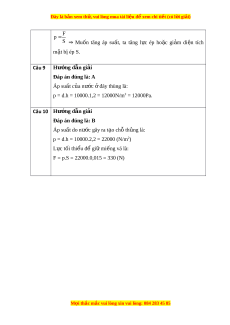 Đây là bản xem th , vu ử i lòng mua tài li u ệ đ xe ể m chi ti t (c ế ó l i ờ gi i ả ) Đáp án đúng là: C Đ n ơ v c ị a ủ áp l c l ự à Niut n ơ (N). Câu 6 Hư ng d ớ ẫn gi i ả Đáp án đúng là: C Áp su t ấ ch t ấ l ng ỏ phụ thu c ộ vào độ sâu c a ủ đi m ể ta xét, ở m t ặ dư i ớ c a ủ kh i ố l p ậ phư ng ơ sẽ tư ng ơ ng ứ v i