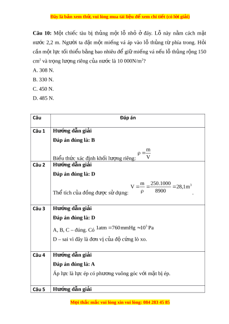 Đây là bản xem th , vu ử i lòng mua tài li u ệ đ xe ể m chi ti t (c ế ó l i ờ gi i ả ) B. Pa. C. N. D. N/cm2. Câu 6: Khi nhúng m t ộ kh i ố l p ậ phư ng ơ vào nư c, ớ m t ặ nào c a ủ kh i ố l p ậ phư ng ơ ch u áp l ị c l ự n nh ớ t ấ c a n ủ ư c ớ ? A. Áp l c ự nh nhau ư c ở ả 6 m t ặ . B. M t ặ trên. C. M t ặ dư i ớ . D. Các m t ặ bên. Câu 7: M t ộ khối s t ắ đ c ặ hình h p ộ chữ nh t ậ , có kích thư c ớ các c nh ạ tư ng ơ ng