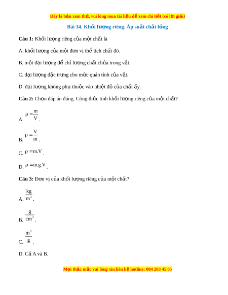 Đây là bản xem th , vu ử i lòng mua tài li u ệ đ xe ể m chi ti t ế (có l i ờ gi i ả ) Bài 34. Kh i ố lư ng ợ riêng. Áp su t ấ ch t ấ l ng ỏ Câu 1: Khối lư ng r ợ iêng c a m ủ t ộ ch t ấ là A. kh i ố lư ng ợ c a m ủ t ộ đ n ơ v t ị h t ể ích ch t ấ đó. B. m t ộ đ i ạ lư ng đ ợ ch ể l ỉ ư ng ch ợ t ấ ch a ứ trong v t ậ . C. đ i ạ lư ng đ ợ c ặ tr ng cho m ư c ứ quán tính c a v ủ t ậ . D. đ i ạ lư ng ợ không ph t ụ hu c vào nhi ộ t ệ đ c ộ a ủ ch t ấ y ấ . Câu 2: Ch n