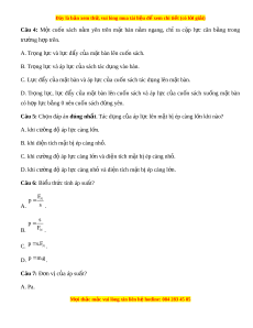ọ đáp án đúng nh t ấ . Tác d ng c ụ a ủ áp l c l ự ên m t ặ b ép ị càng l n khi ớ nào? A. khi cư ng đ ờ ộ áp l c càng l ự n. ớ B. khi di n t ệ ích m t ặ b ép càng nh ị . ỏ C. khi cư ng ờ đ áp l ộ c càng ự l n và di ớ n t ệ ích m t ặ b ép càng nh ị . ỏ D. khi cư ng đ ờ ộ áp l c càng nh ự ỏ và di n t ệ ích m t ặ b ép càng l ị n. ớ Câu 6: Bi u ể th c t ứ ính áp su t ấ ? FN p A. s . s p B. FN . C. p s .FN . D. p m .g . Câu 7: Đ n ơ v c ị a ủ áp su t ấ ? A. Pa. M i ọ thắc m c