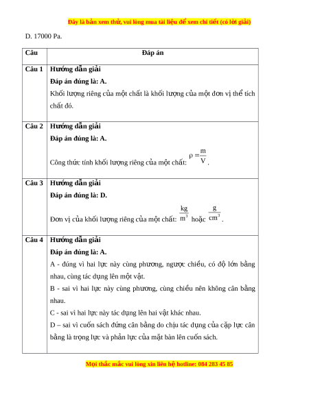 Đây là bản xem th , vu ử i lòng mua tài li u ệ đ xe ể m chi ti t ế (có l i ờ gi i ả ) D. 17000 Pa. Câu Đáp án Câu 1 Hư ng ớ d n gi ẫ i ả