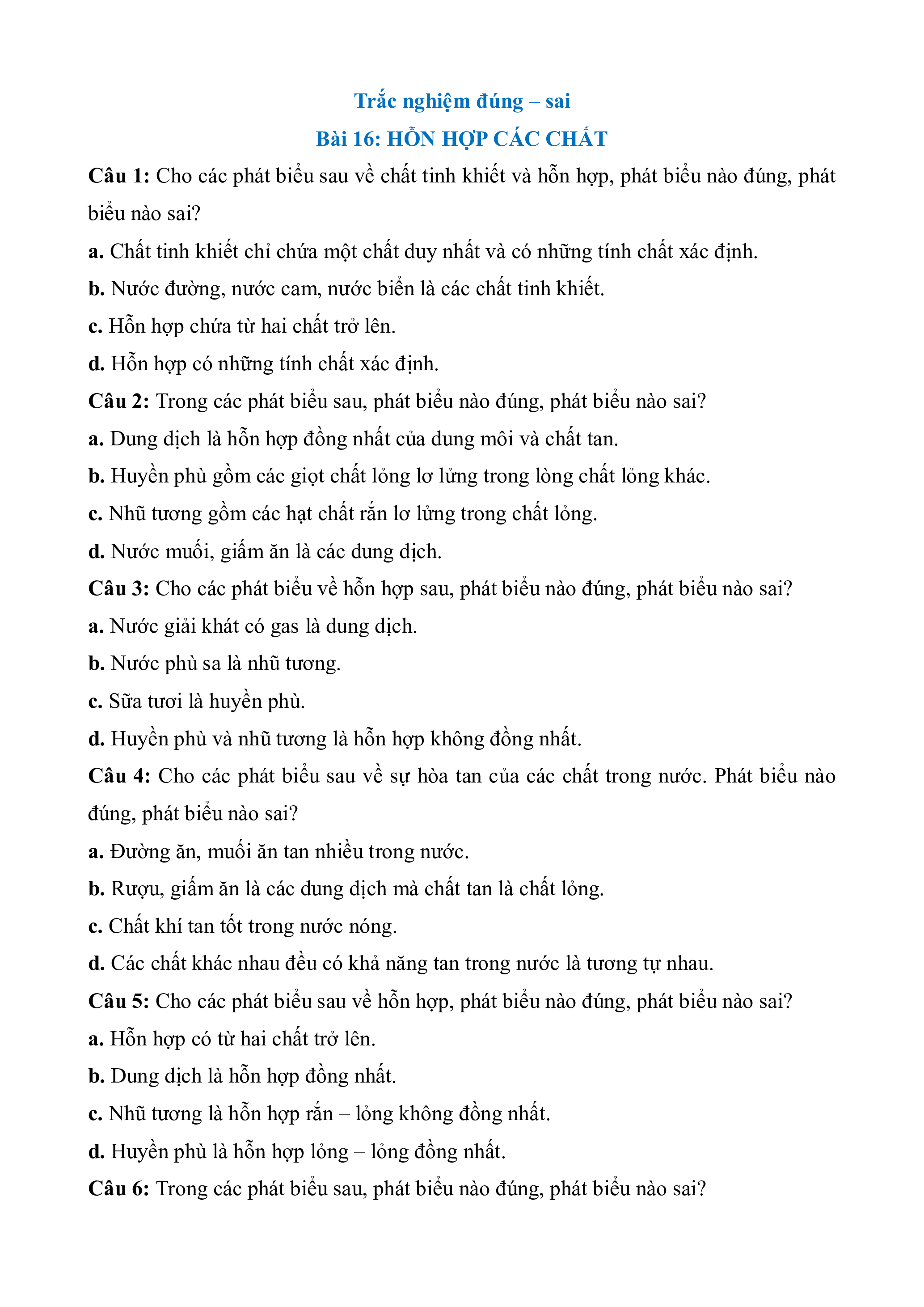 Câu 1: Cho các phát biểu sau về chất tinh khiết và hỗn hợp, phát biểu nào đúng, phát biểu nào sai?